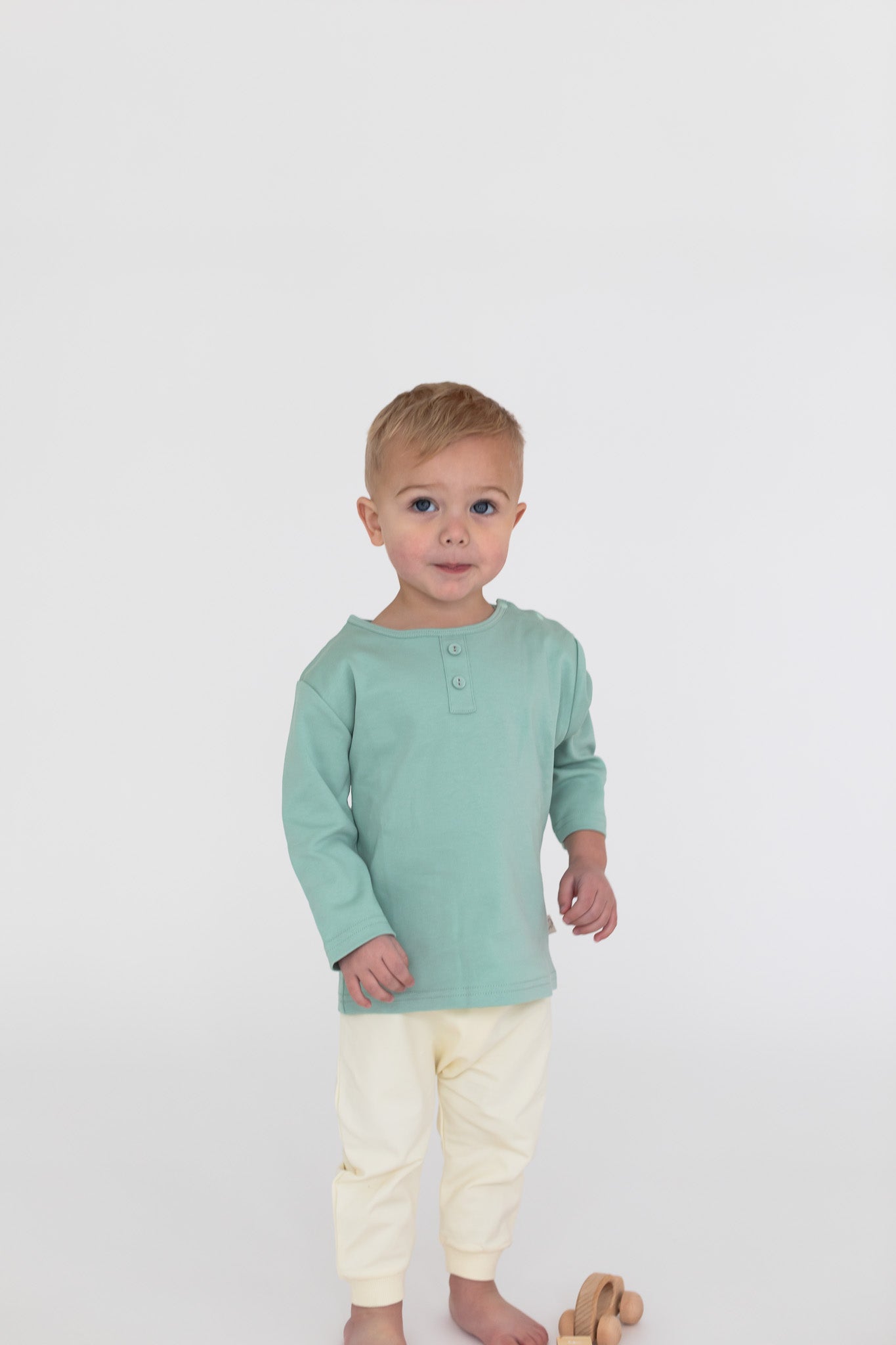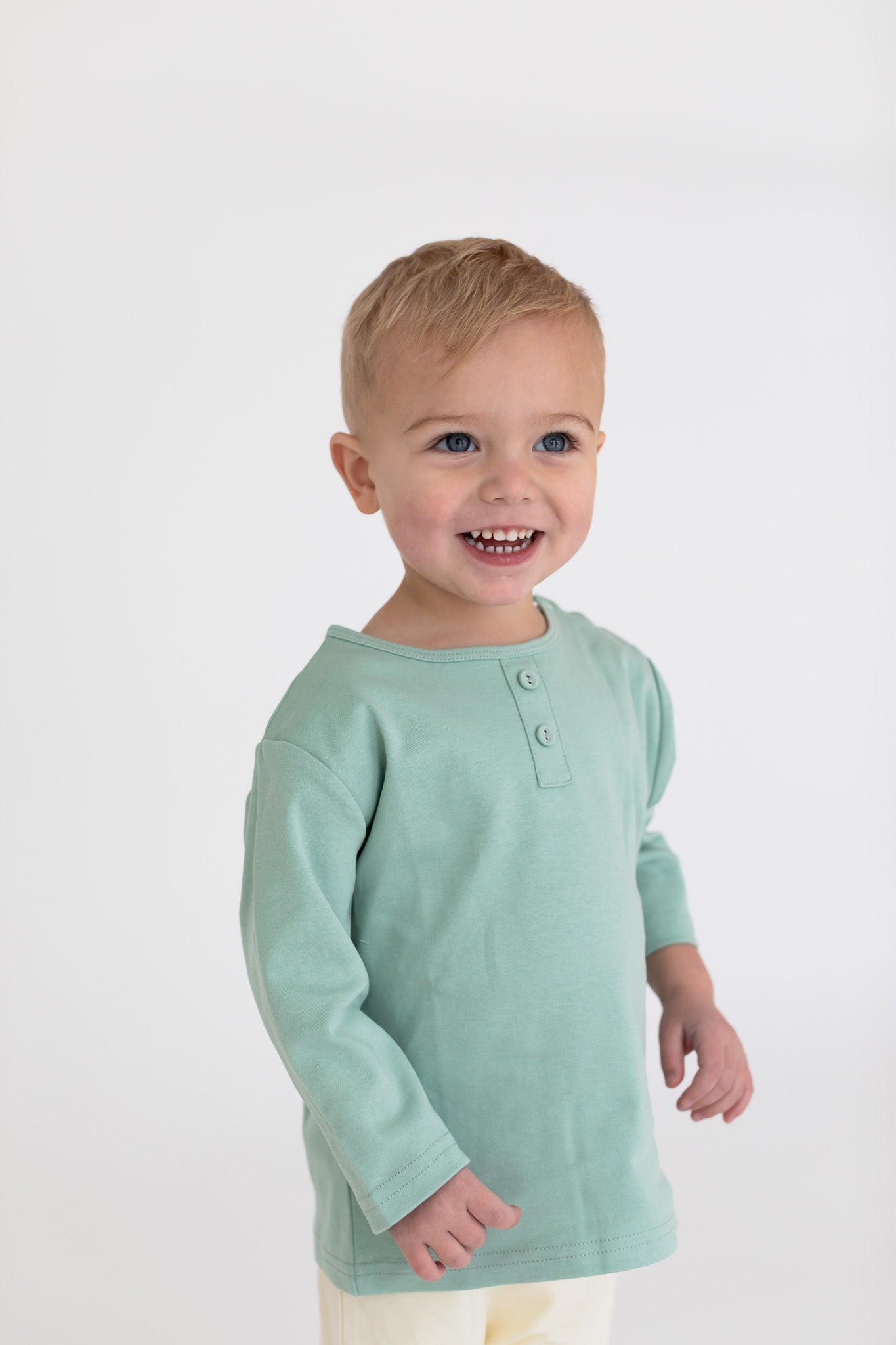 Expertly crafted for everyday wear, the Mineral Green Isaac Henley Shirt is a must-have addition to any boy's wardrobe. Made from a blend of 95% cotton and 5% spandex, this top offers comfort, stretch, and softness. With buttons on the shoulder, it's easy to put on. Upgrade your little one's style game today.