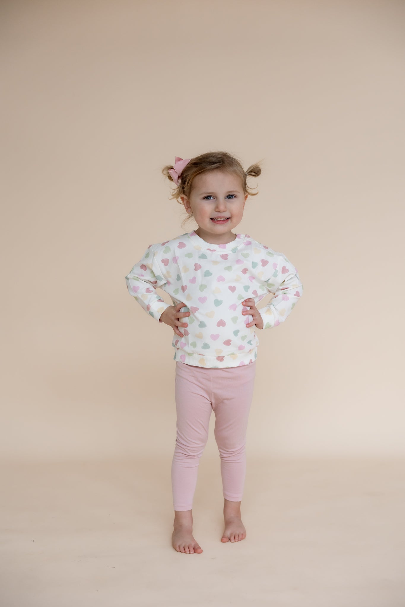 Introducing the Whipped Pink Jolie Leggings, made from 95% bamboo and 5% spandex, for the ultimate comfort and stretch. These versatile leggings pair perfectly with our Linden Blouse, Maisie Sweatshirt, and Sheppard Onesie. A must-have staple for every kid's closet.