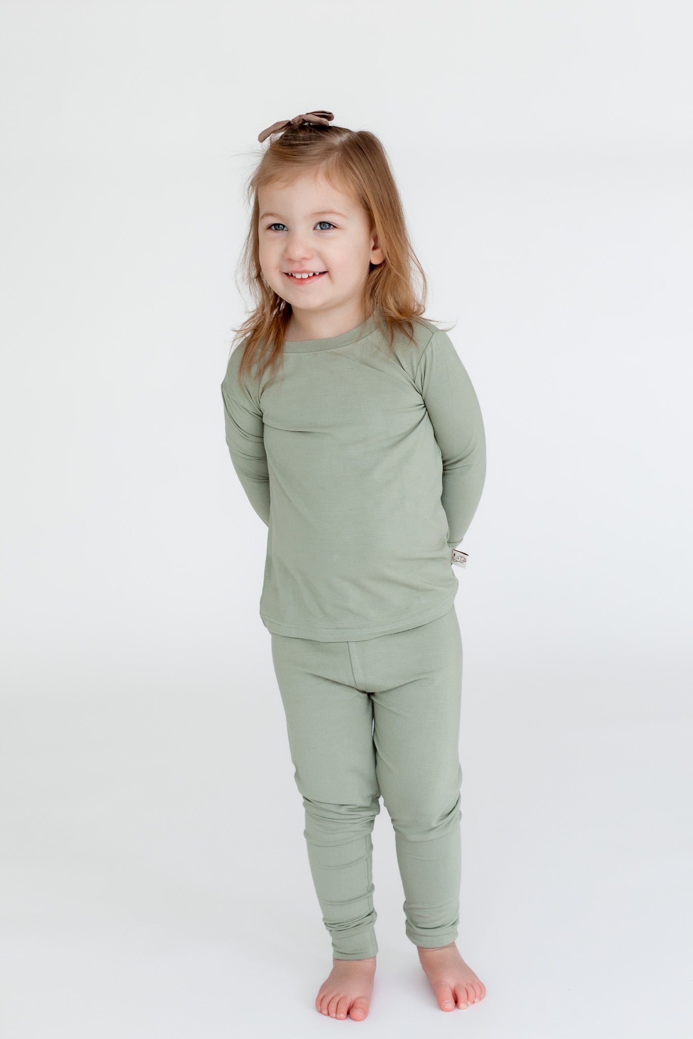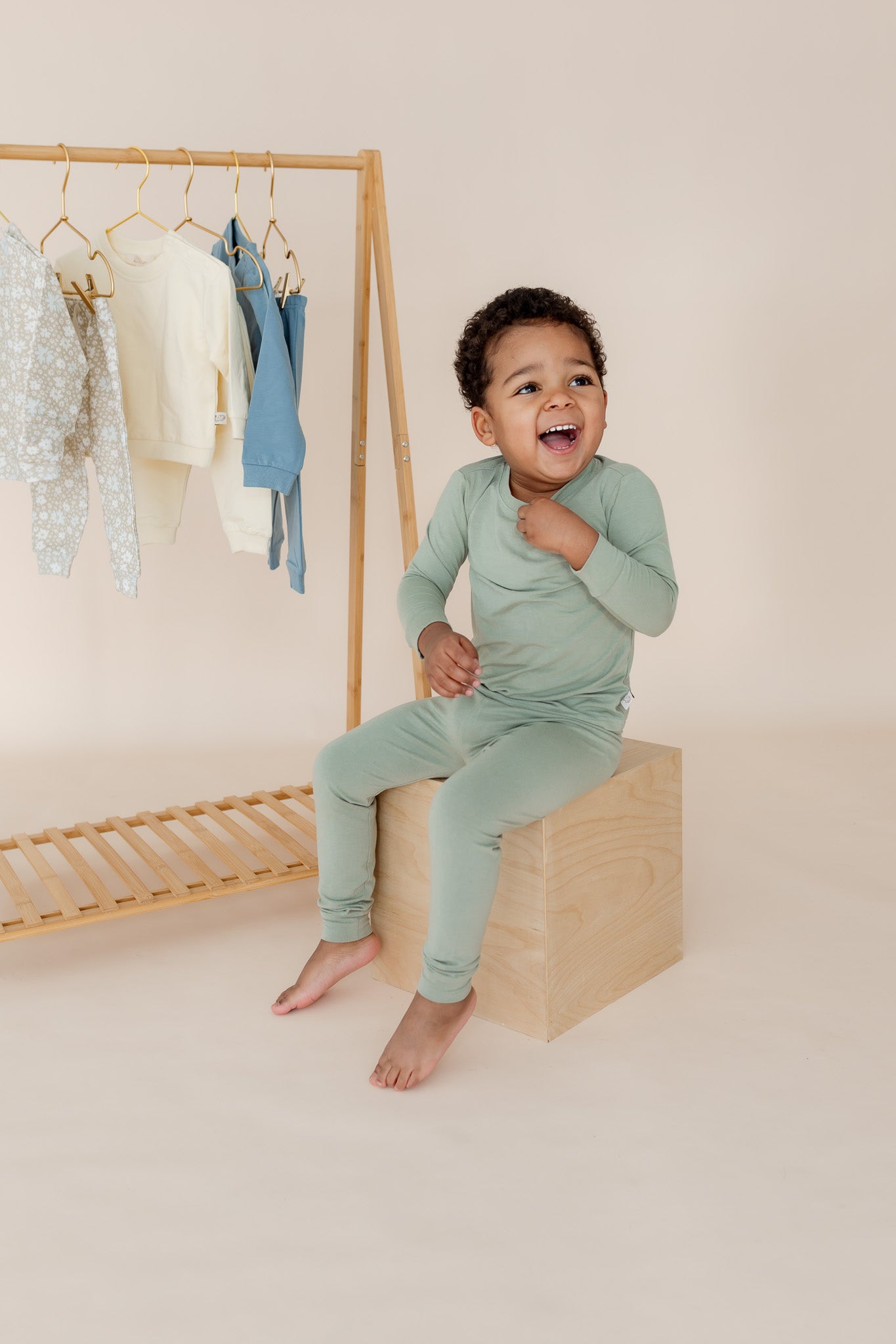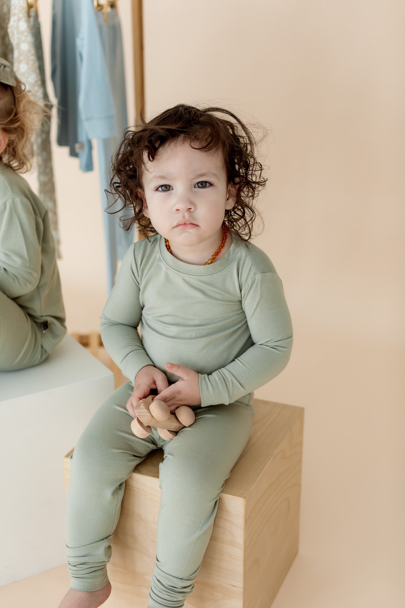 The Mineral Green Two Piece Pajama is the perfect sleepwear for your little ones. Made with 95% viscose bamboo and 5% spandex, it provides maximum comfort and a soft touch. Your child can sleep peacefully without any irritation from tags. Trust in our product for a better night's sleep. A must-have for your little ones.