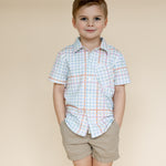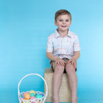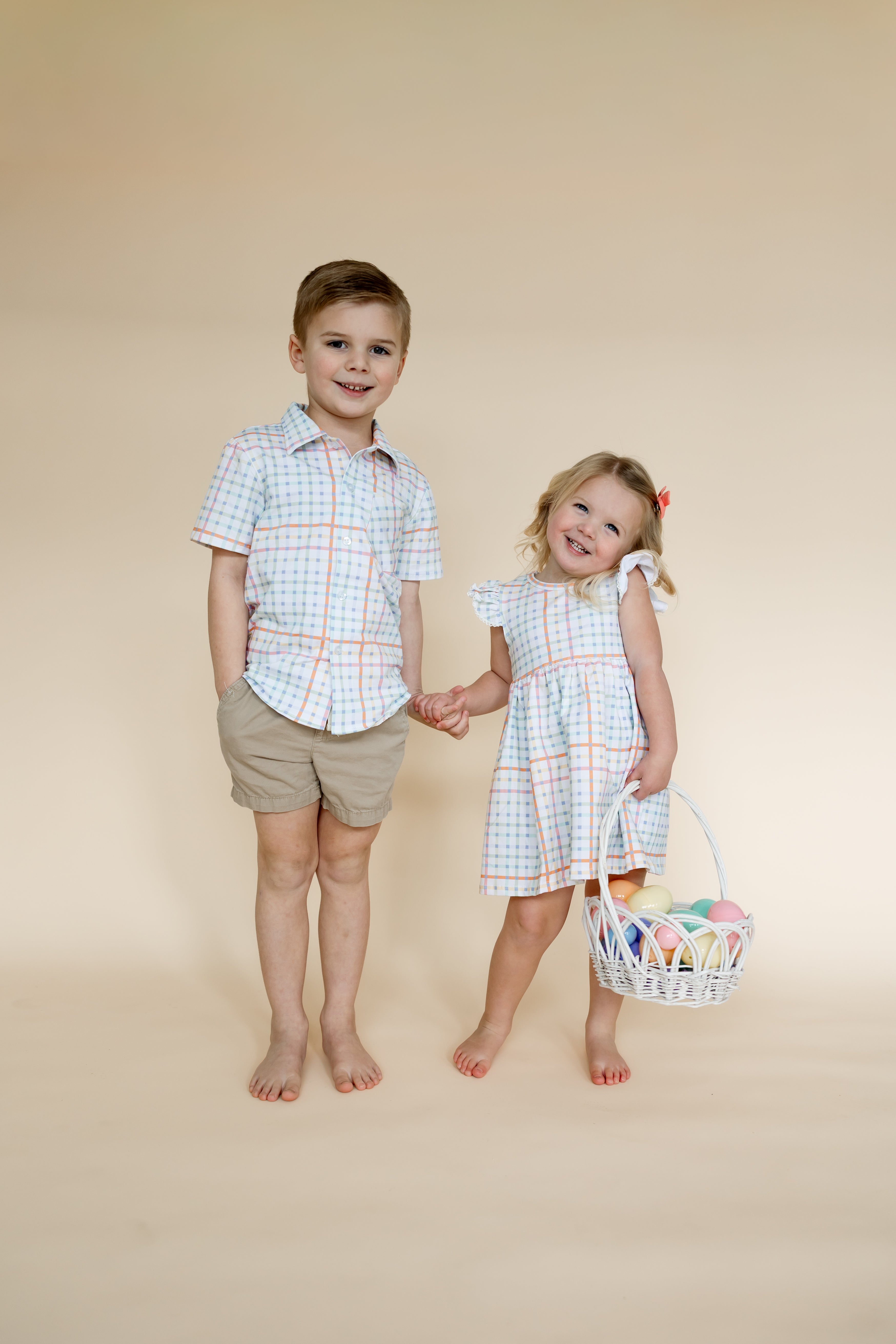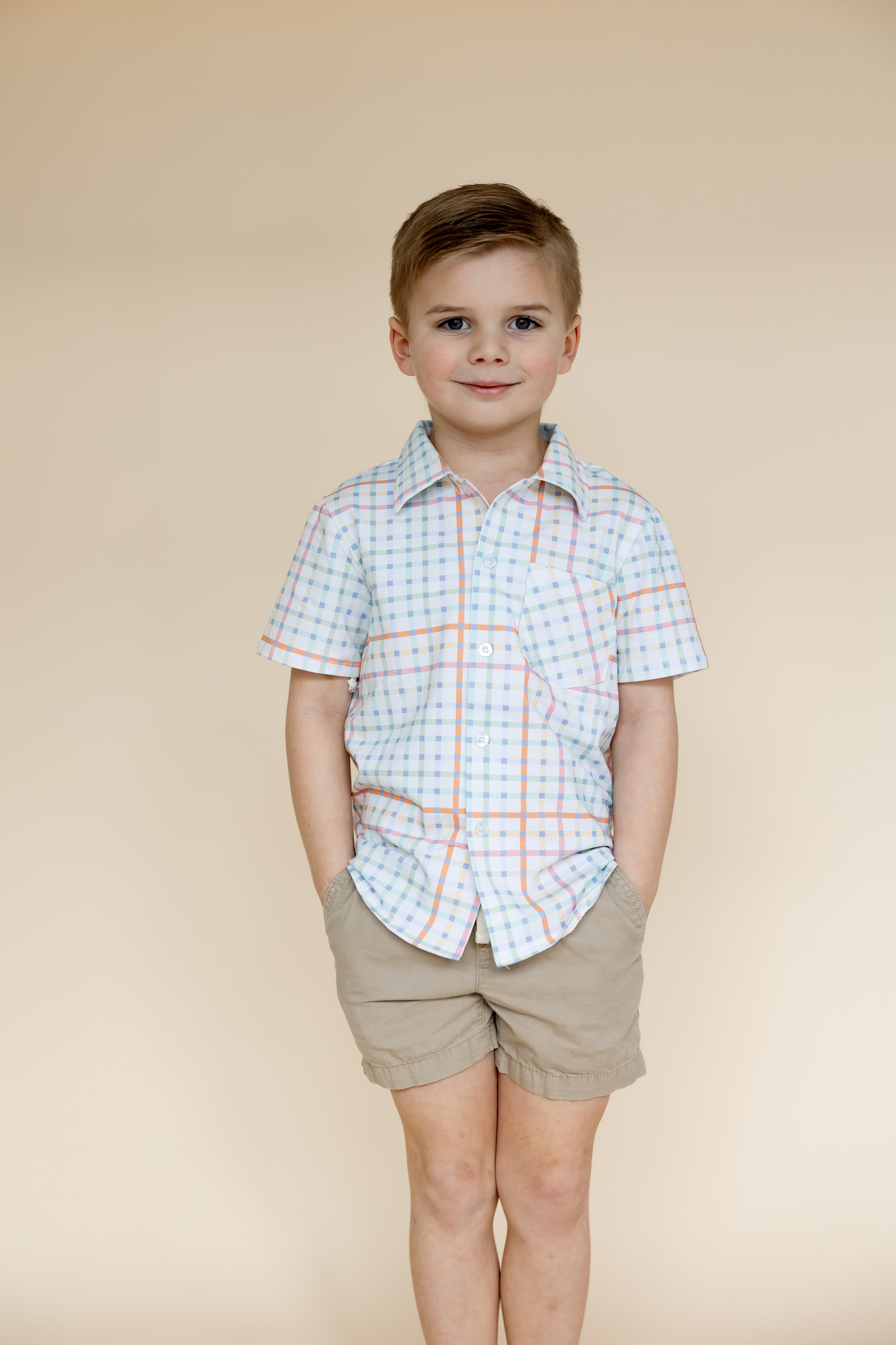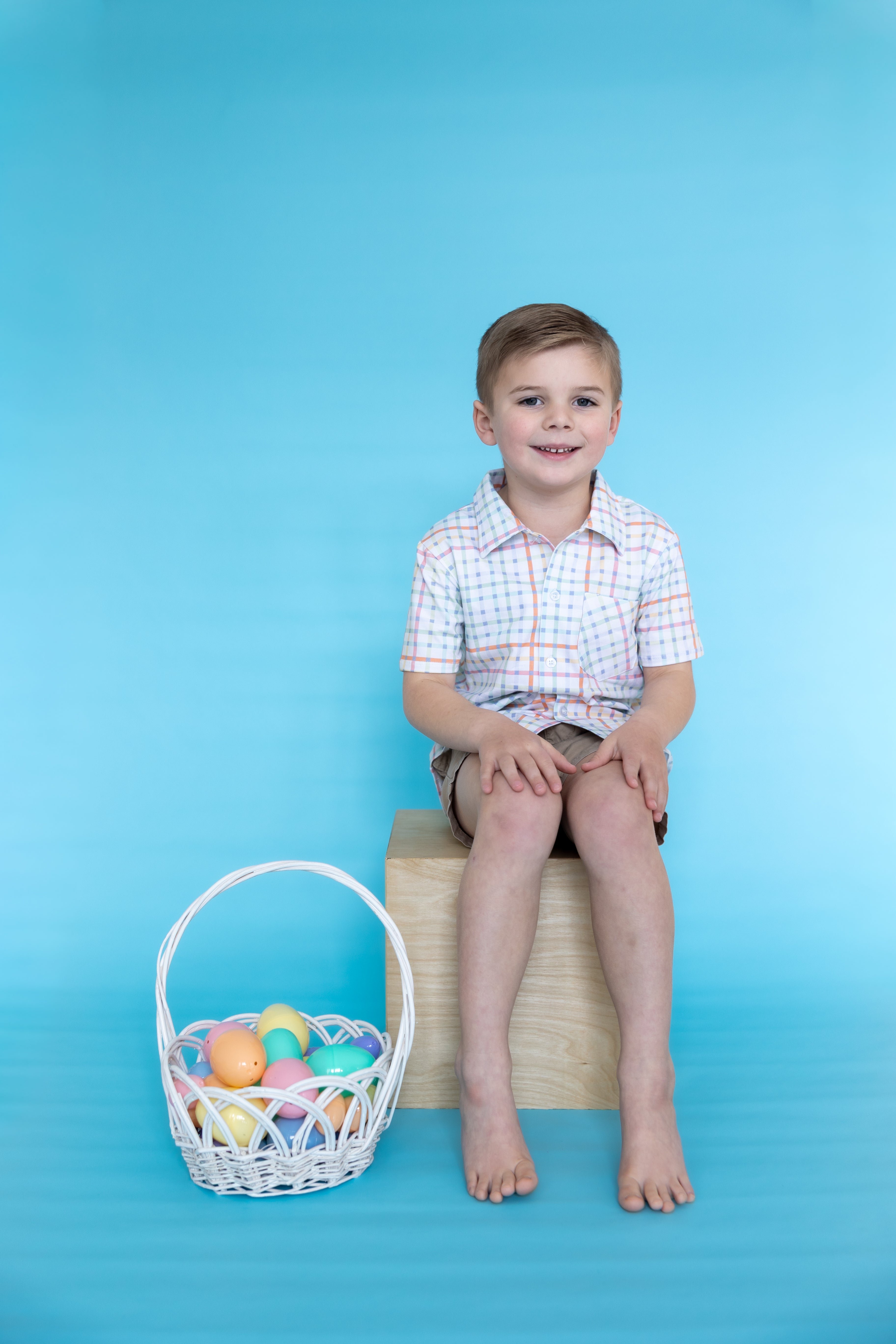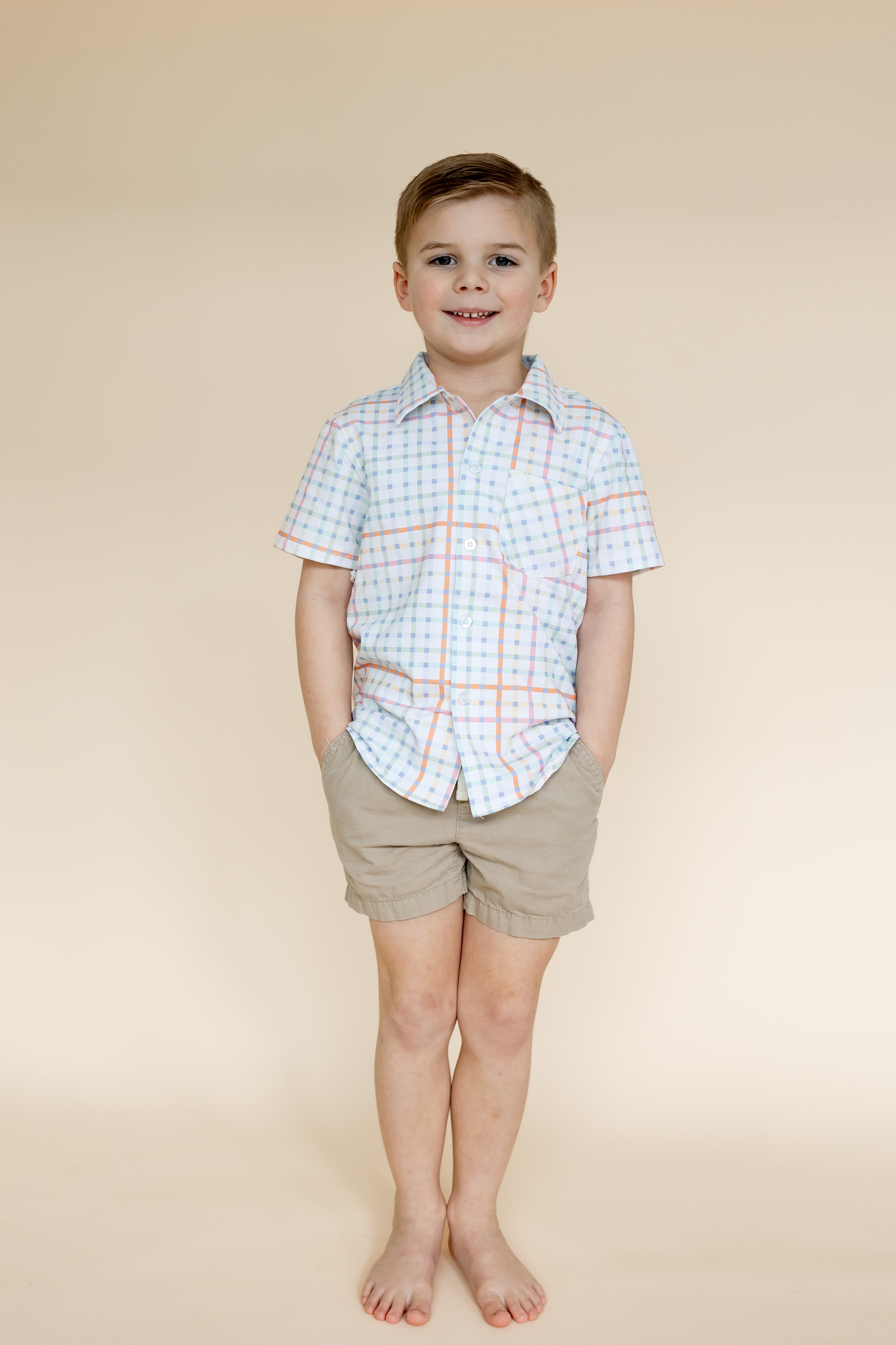 The Owen Button Up in Pastel Plaid is a versatile spring essential featuring a hand-drawn plaid print on soft, stretchy 100% knit cotton. Designed for comfort and durability, this button-up shirt includes working buttons and flexible fabric that moves with active kids. The pastel color palette makes it perfect for Easter, celebrations, and everyday wear. Ideal for parents seeking quality pieces that combine style with practicality.