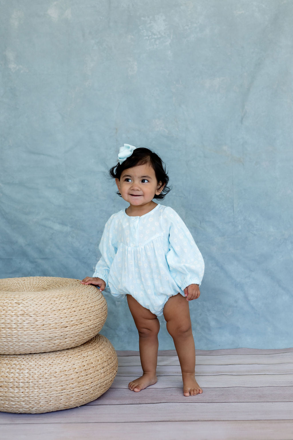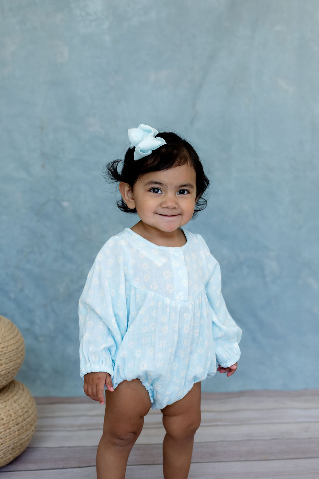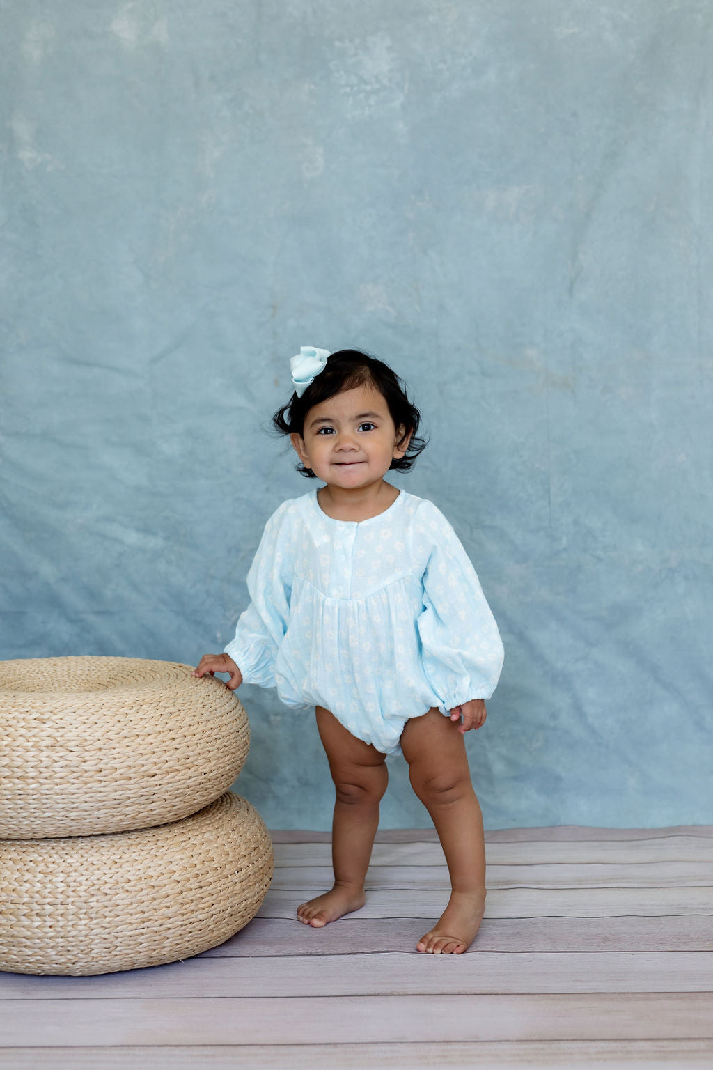 Indulge your little one in luxury with our Tiny Blooms Ice Remi Romper. Crafted from 100% cotton gauze, this bubble romper features snaps down the front and the bottom for easy changes. Adorable and comfortable, the lightweight fabric ensures breathability for your little one. Add tall socks and some sweet shoes for an elegant look.