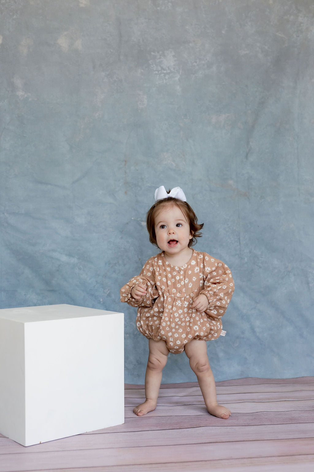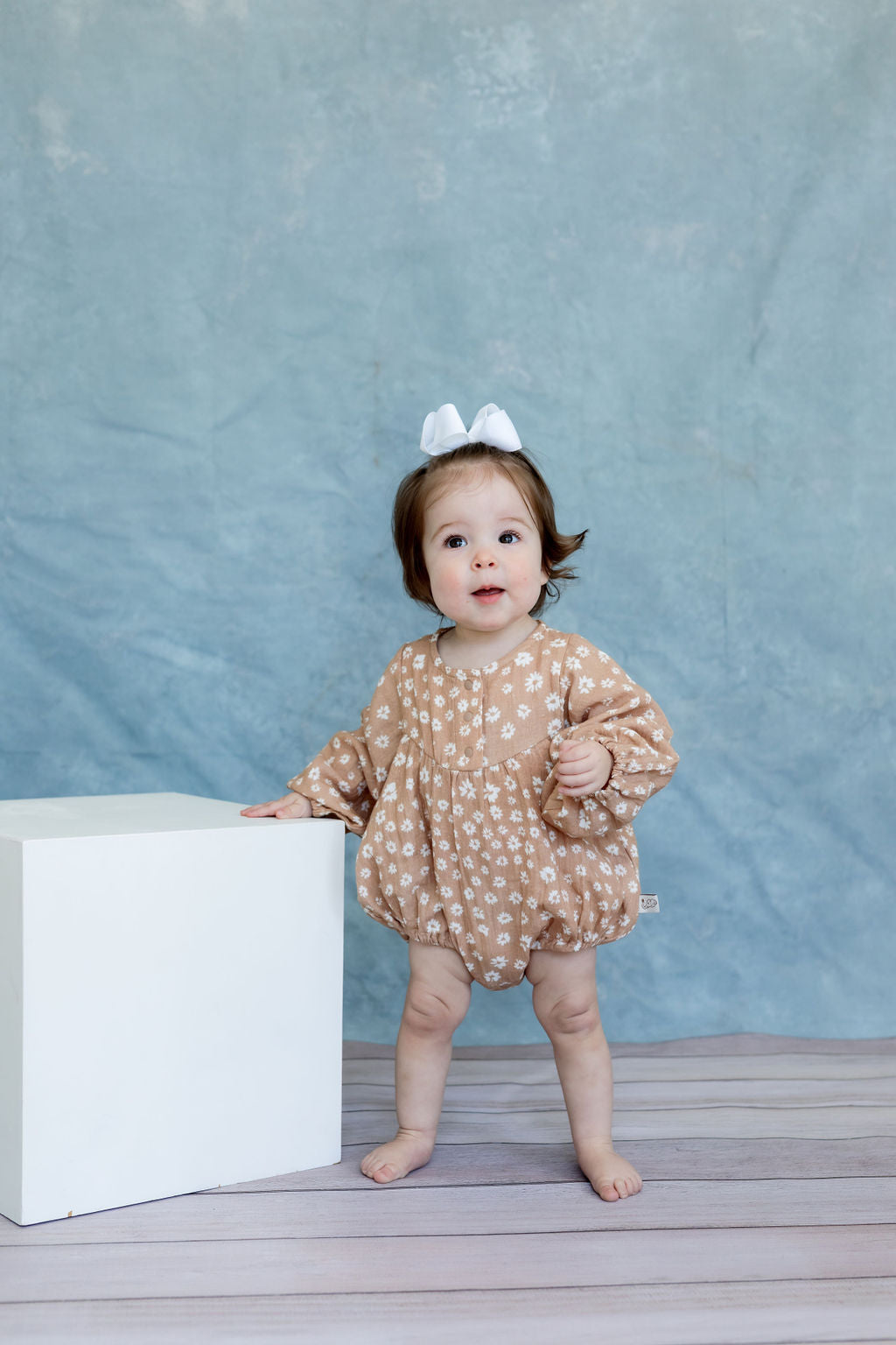 Indulge your little one in luxury with our Tiny Blooms Sand Remi Romper. Crafted from 100% cotton gauze, this bubble romper features snaps down the front and the bottom for easy changes. Adorable and comfortable, the lightweight fabric ensures breathability for your little one. Add tall socks and some sweet shoes for an elegant look.