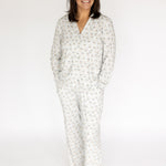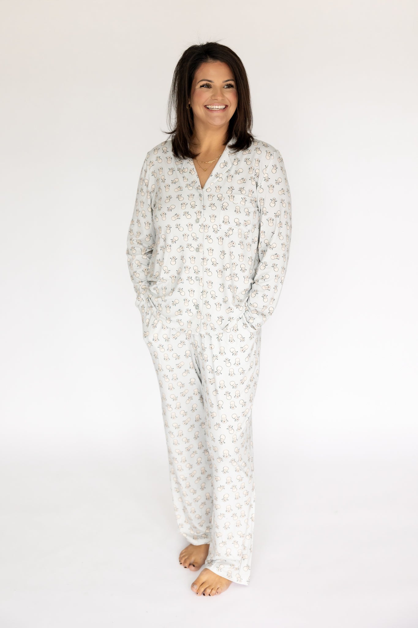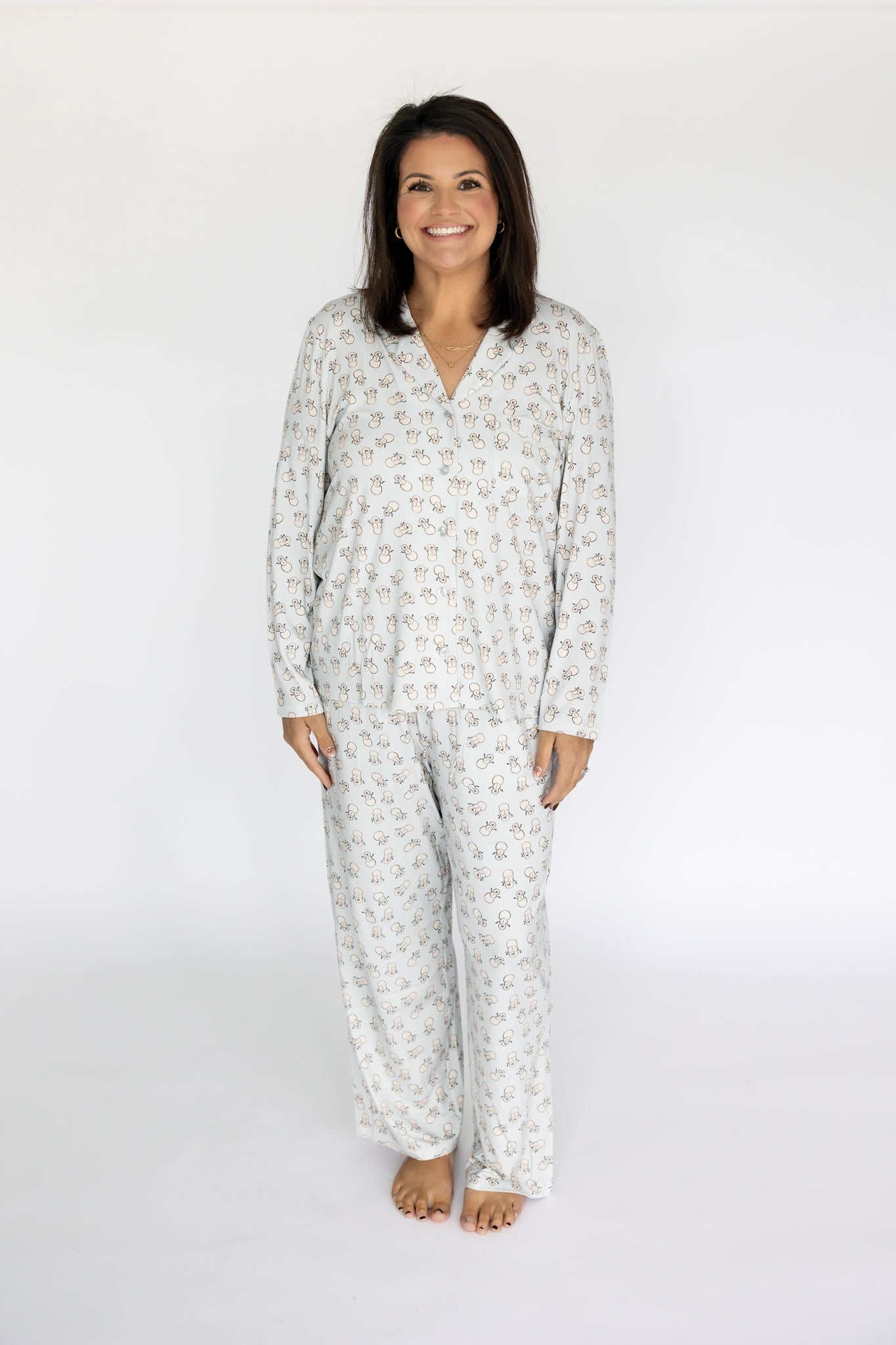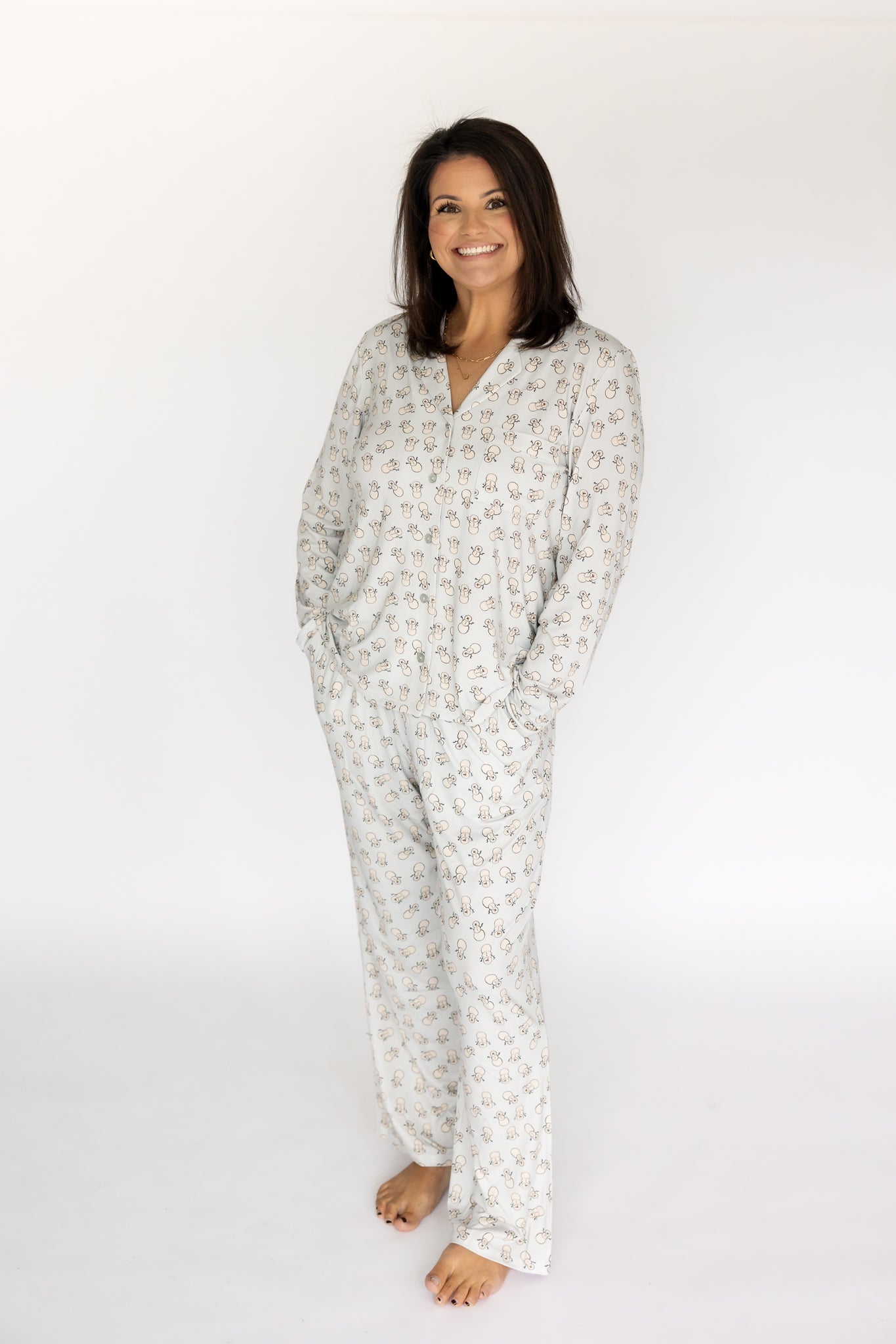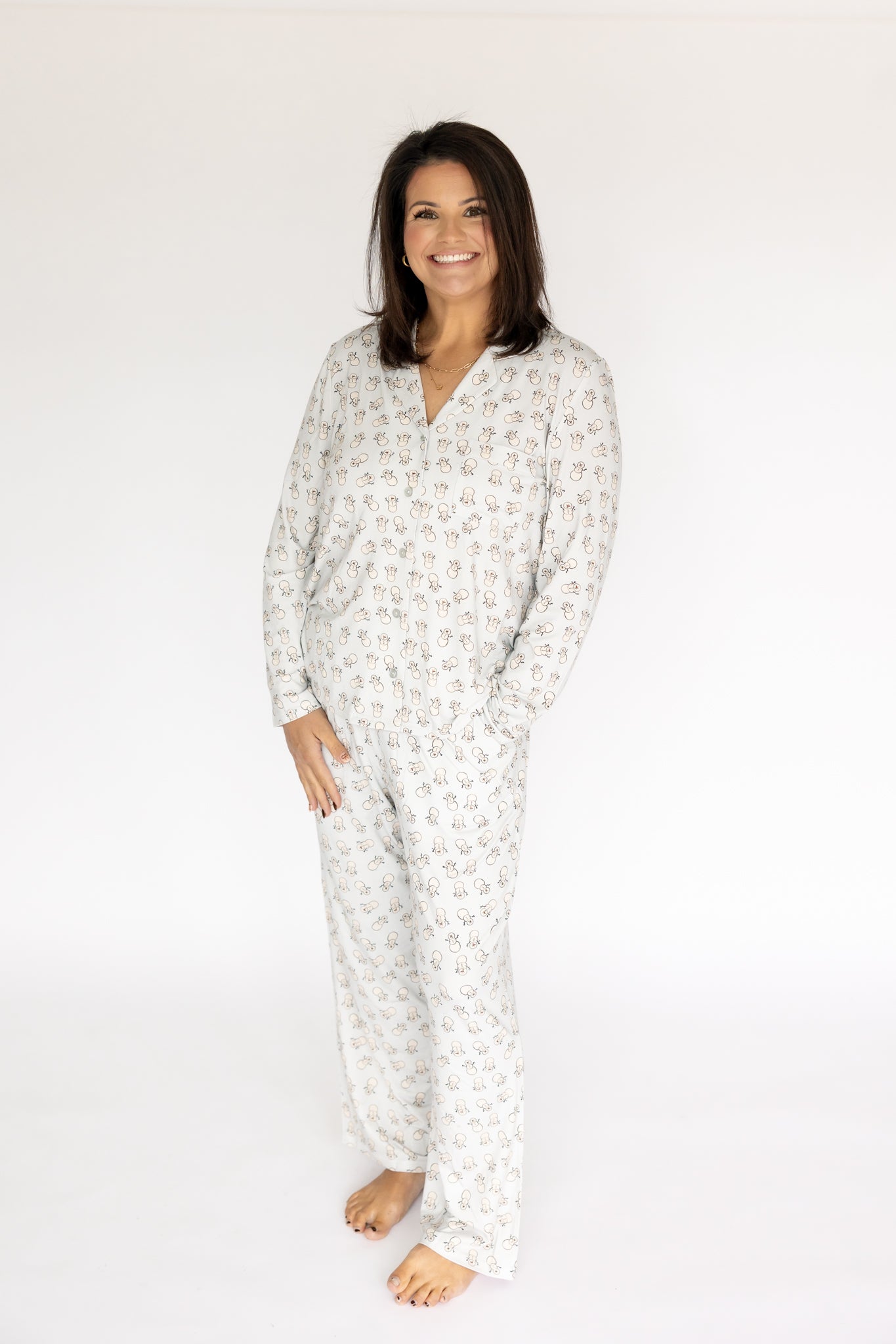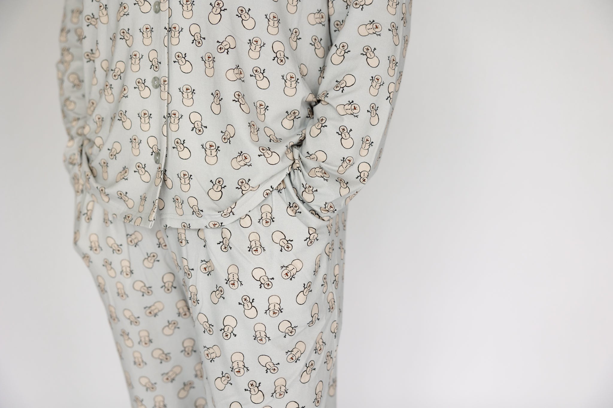Slip into pure comfort with our Women's Tiny Snowmen Set—a two-piece pajama dream that feels as good as it looks. Crafted from a luxurious blend of 95% viscose from bamboo and 5% spandex, this set delivers buttery-soft fabric that your skin will absolutely love. The classic pattern pairs perfectly with practical details: a chest pocket for your essentials, front button closure, and a drawstring waist for the perfect fit. Whether you're lounging all day or catching some Z's, you'll feel wrapped in cozy bliss. Our model wears a Medium for reference.