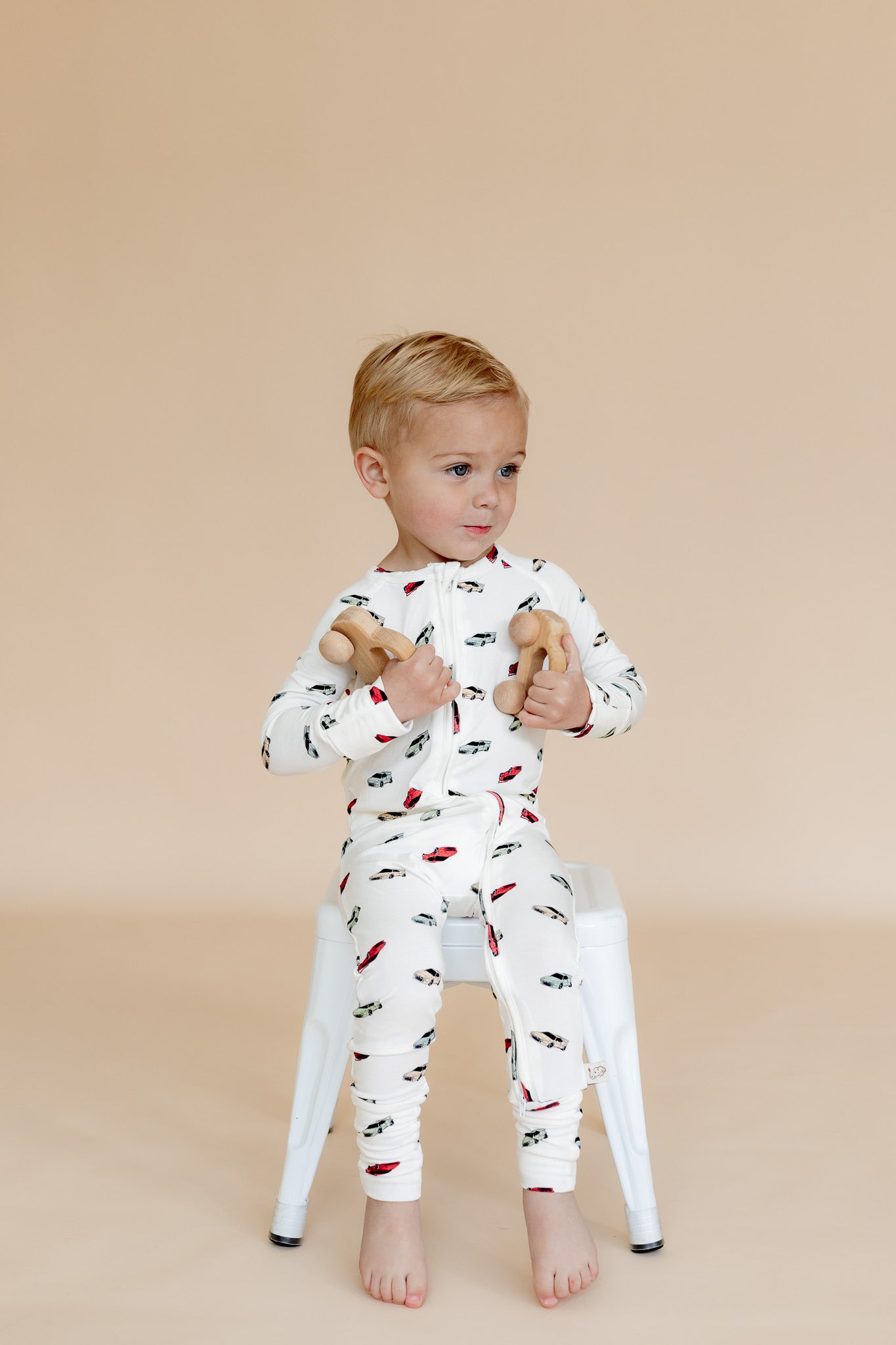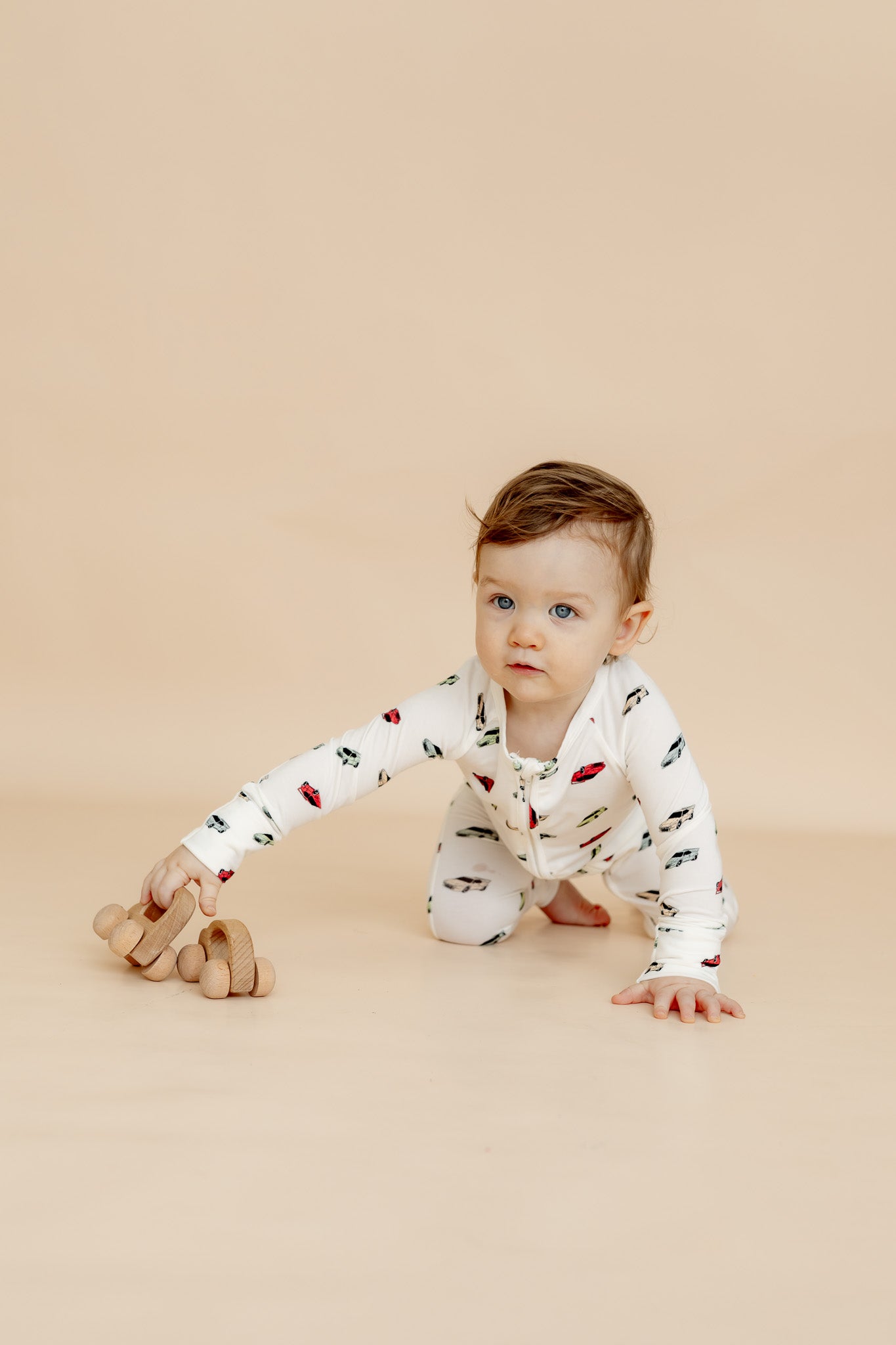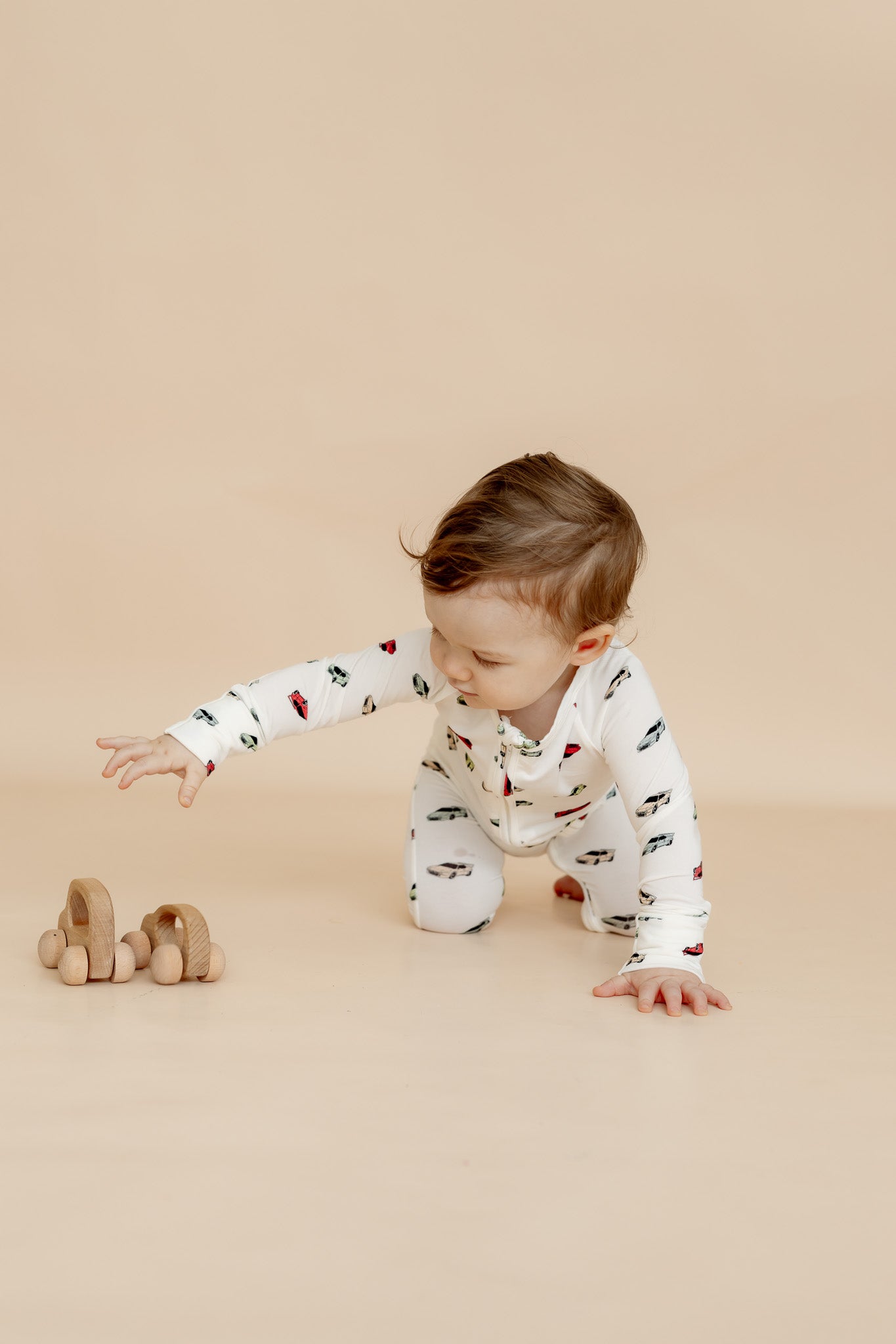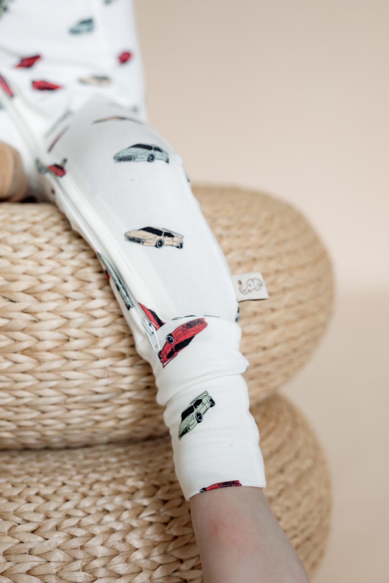 Featuring hand-drawn car prints by a local artist, the Little Vroomsters Zipper Sleeper makes everyday wear feel special and adds a playful touch to bedtime.