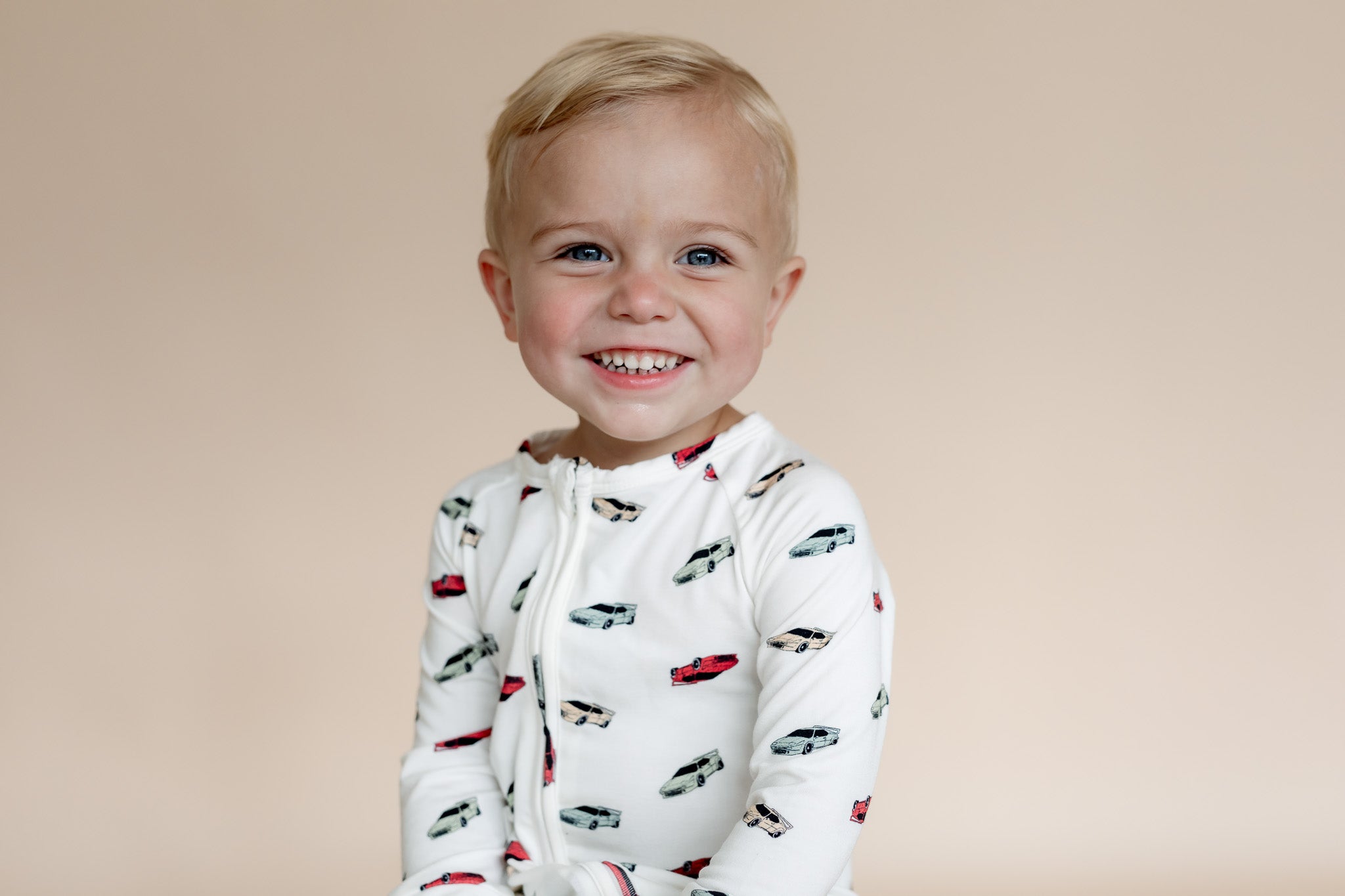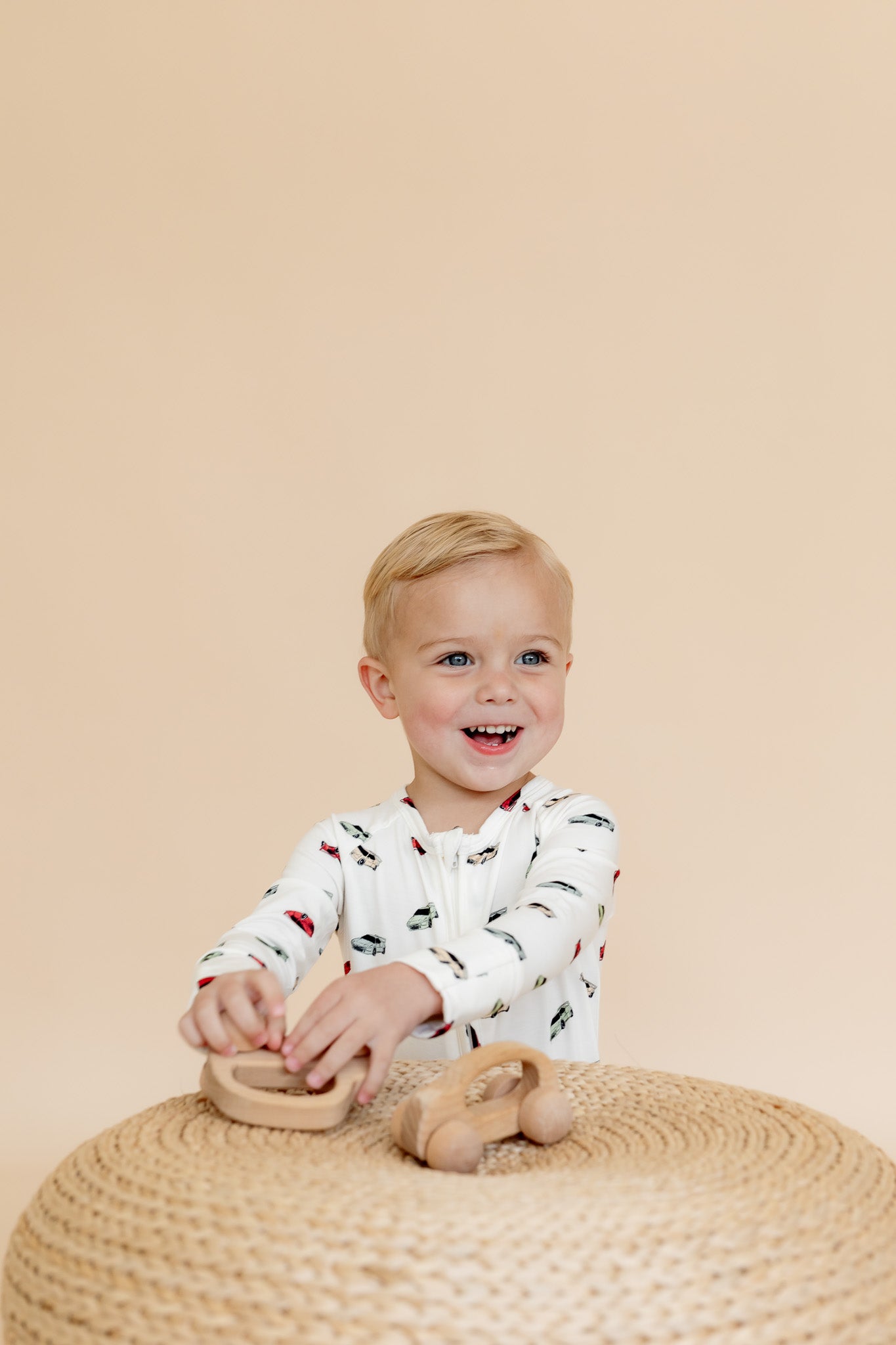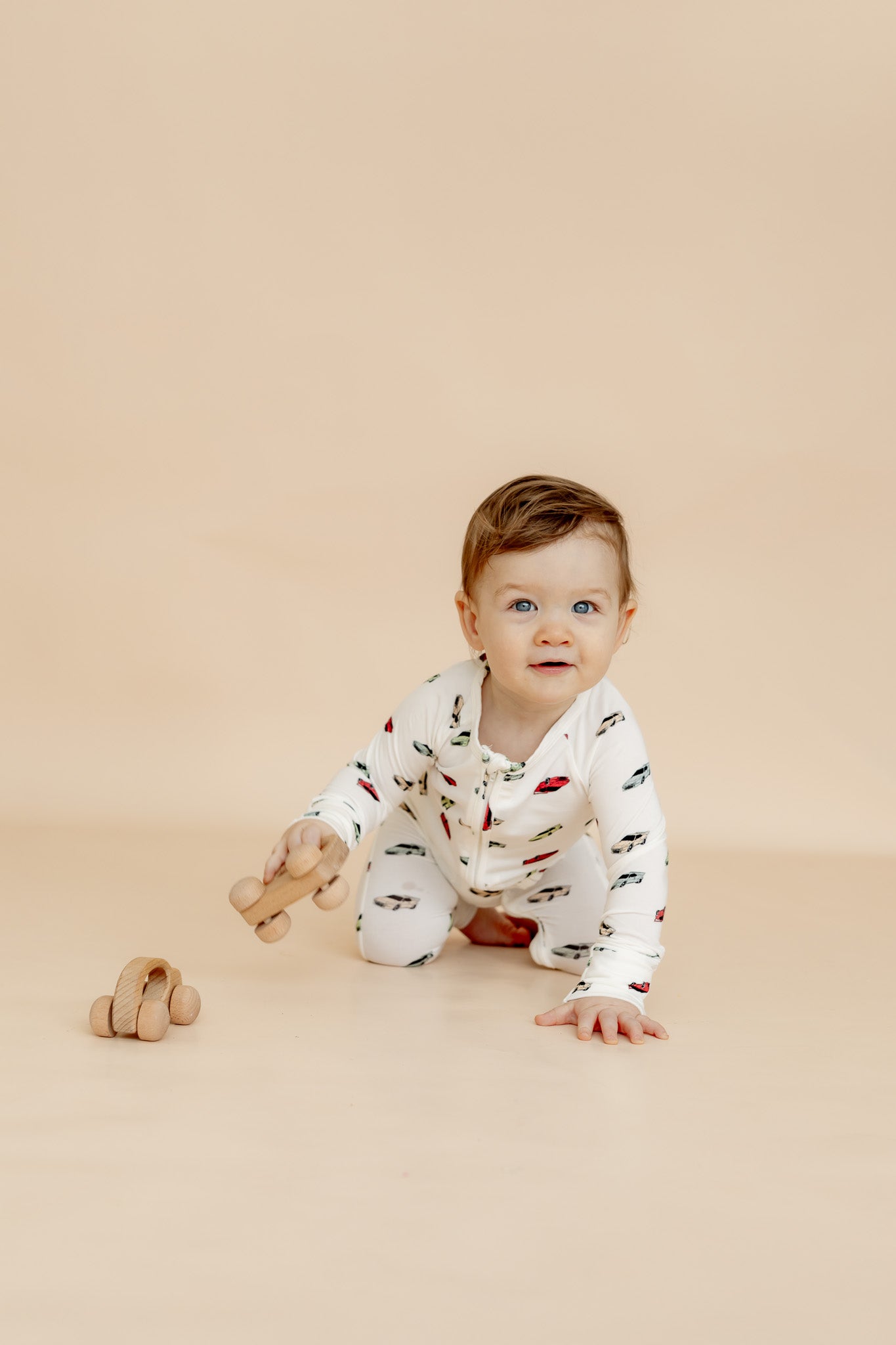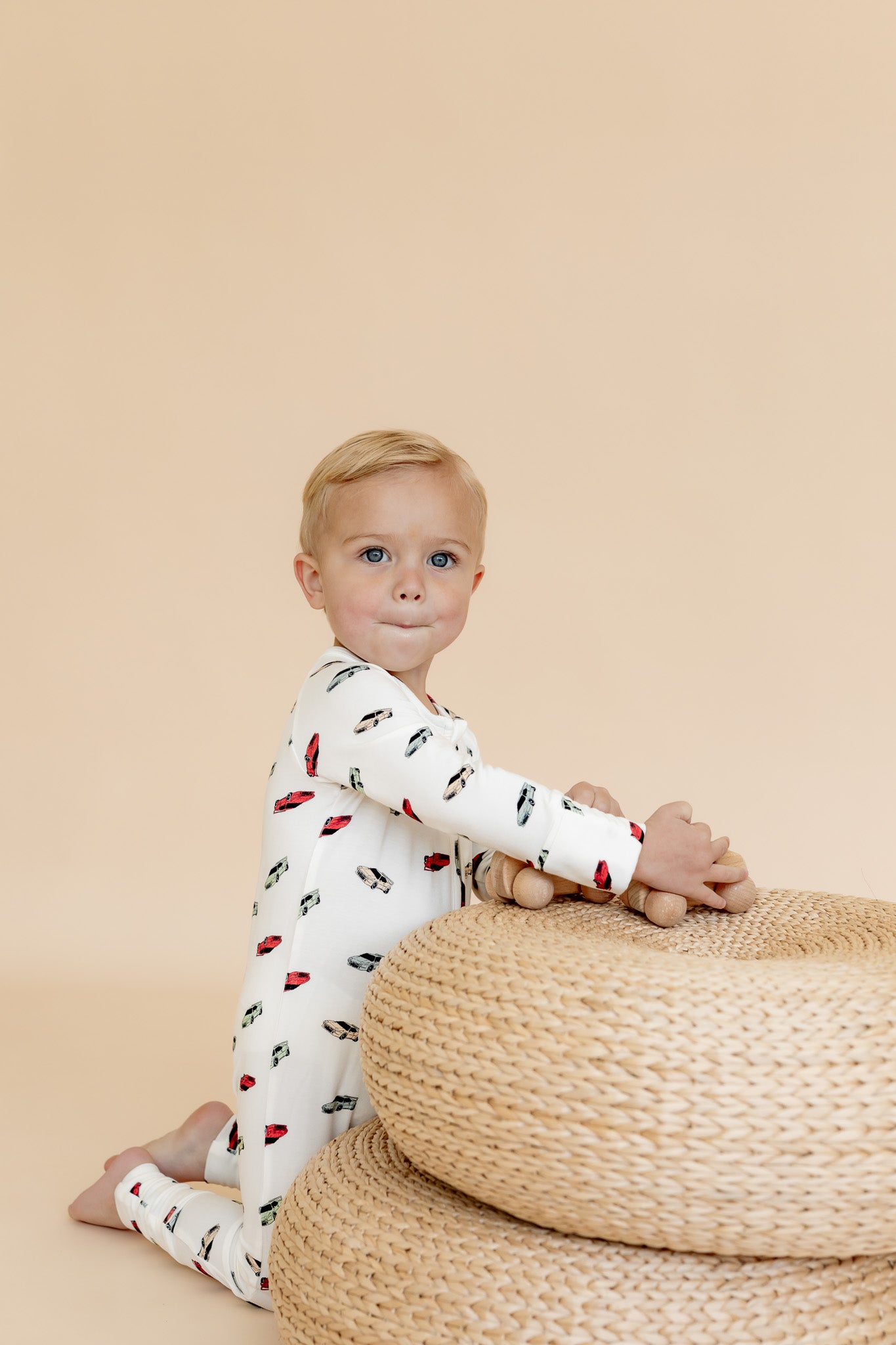 Featuring hand-drawn car prints by a local artist, the Little Vroomsters Zipper Sleeper makes everyday wear feel special and adds a playful touch to bedtime.