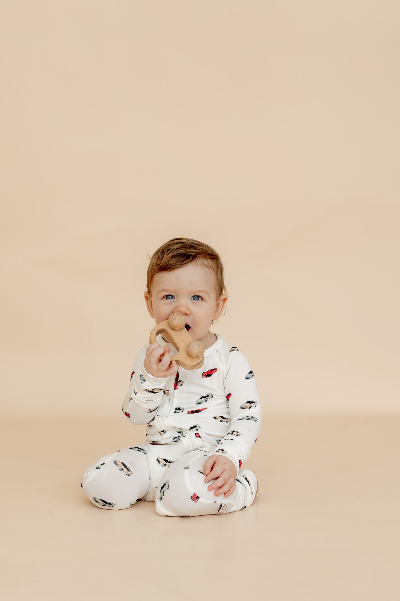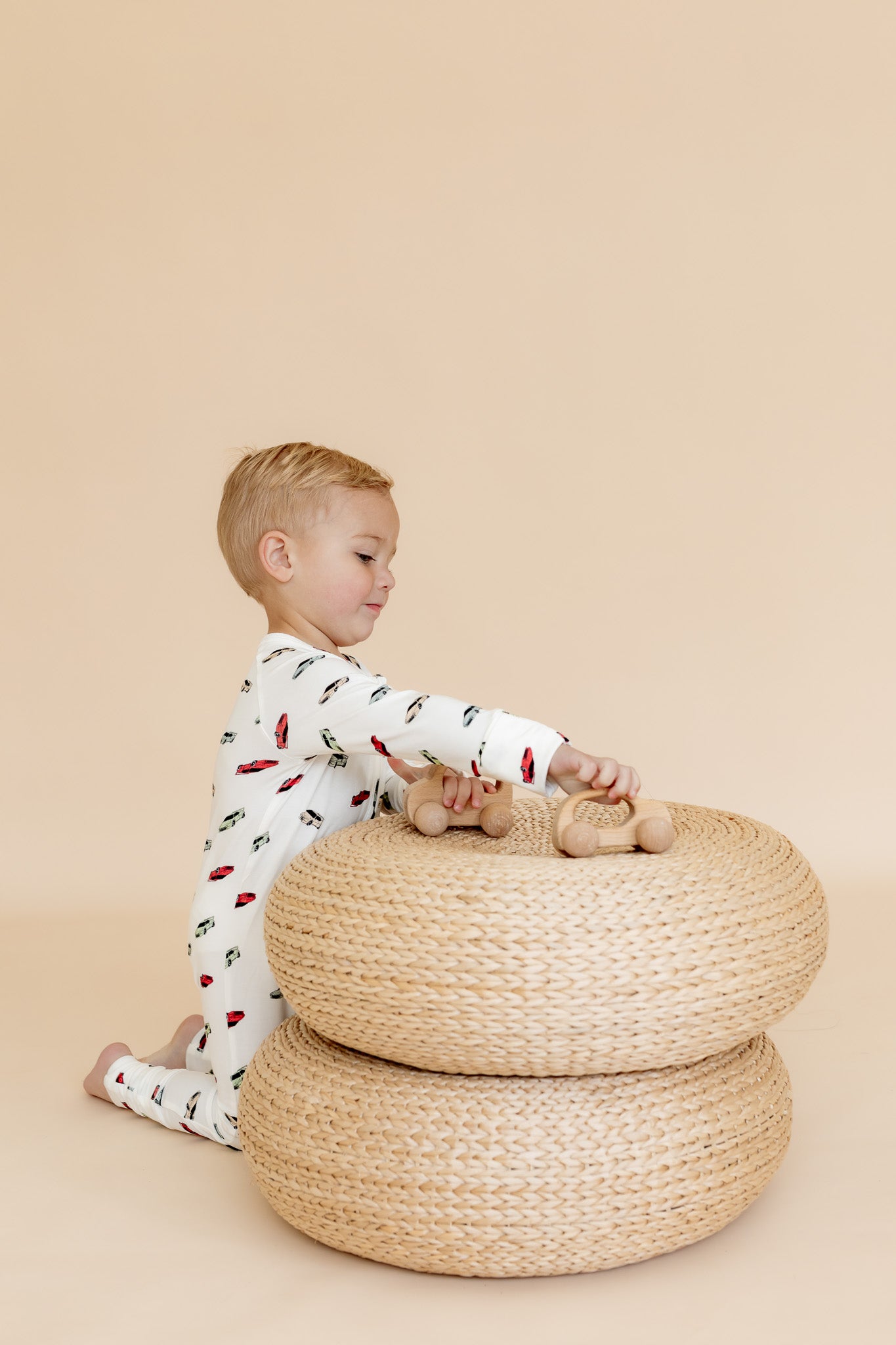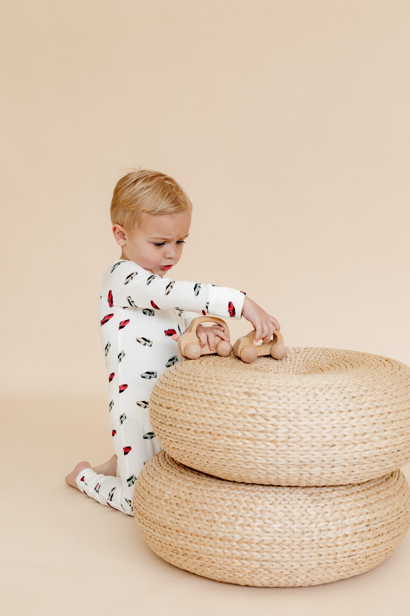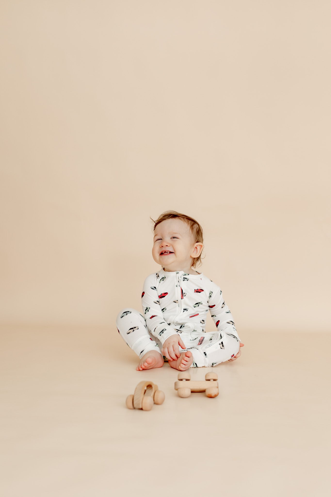 Featuring hand-drawn car prints by a local artist, the Little Vroomsters Zipper Sleeper makes everyday wear feel special and adds a playful touch to bedtime.